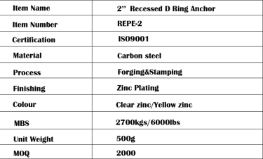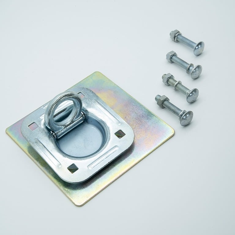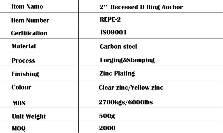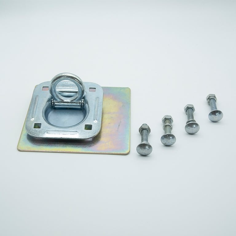 TECHNICAL FEATURE: 1. EASY INSTALLATION: There are 4 square holes in each corner of the pan fitting (it’s also can be round hole). Just cutting a hole with saw or chisel in the floor of your vehicle, putting the recessed anchor into the hole on the floor, and bolt on the 4 square holes with carriage bolts. The D-ring lines flush inside the pan when it’s not in use, and is to be lifted upward when it is in use. 2. WIDE USAGE: Recessed pan fitting tie down ring is a perfect choice when you don’t want to put the tie down anchor out of the floor, which it integrates the pan fitting as one with the floor of your vehicle. And the pan fitting is compatible with many application, such as S hook, J hook, cam straps, ratchet straps or clevis grab hook chains, etc. 3. RUST RESISTANCE: The pan fitting is made of galvanized steel, with yellow or white zinc color on the surface, to protect from rust and corrosion, providing a long term use. 4. POWERFUL LOADING: The pan fitting provides assembly break strength of 6000lbs, and working load limit of 2000lbs, which secure the cargo firmly in a long haul.