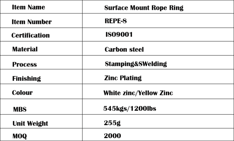 The surface mount rope Ring anchors are designed to provide a secure and versatile anchoring solution ideal for a variety of applications. It is able to withstand heavy loads and harsh environmental conditions. This makes it ideal for both indoor and outdoor use, ensuring long-lasting reliability. Whether you need to secure equipment to a truck bed, trailer or even a concrete floor, our D-ring anchors can be securely installed in minutes, which makes it the perfect solution for both business and recreational use.