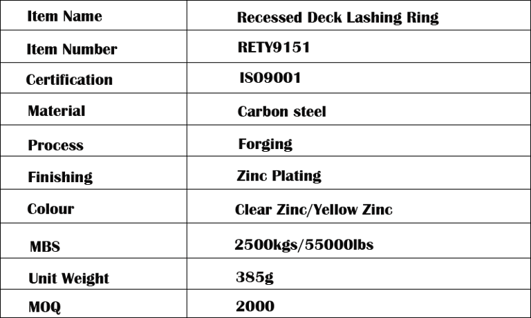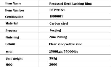 1. Made of alloy steel, by production technology of forging. 2. With load capacities up to 5500lbs, the recessed deck lashing ring provide unrivaled security and stability. 3. Galvanized finishing protect the parts from rust and corrosion. 4. Installation is quick and easy, requiring minimal effort and tools.